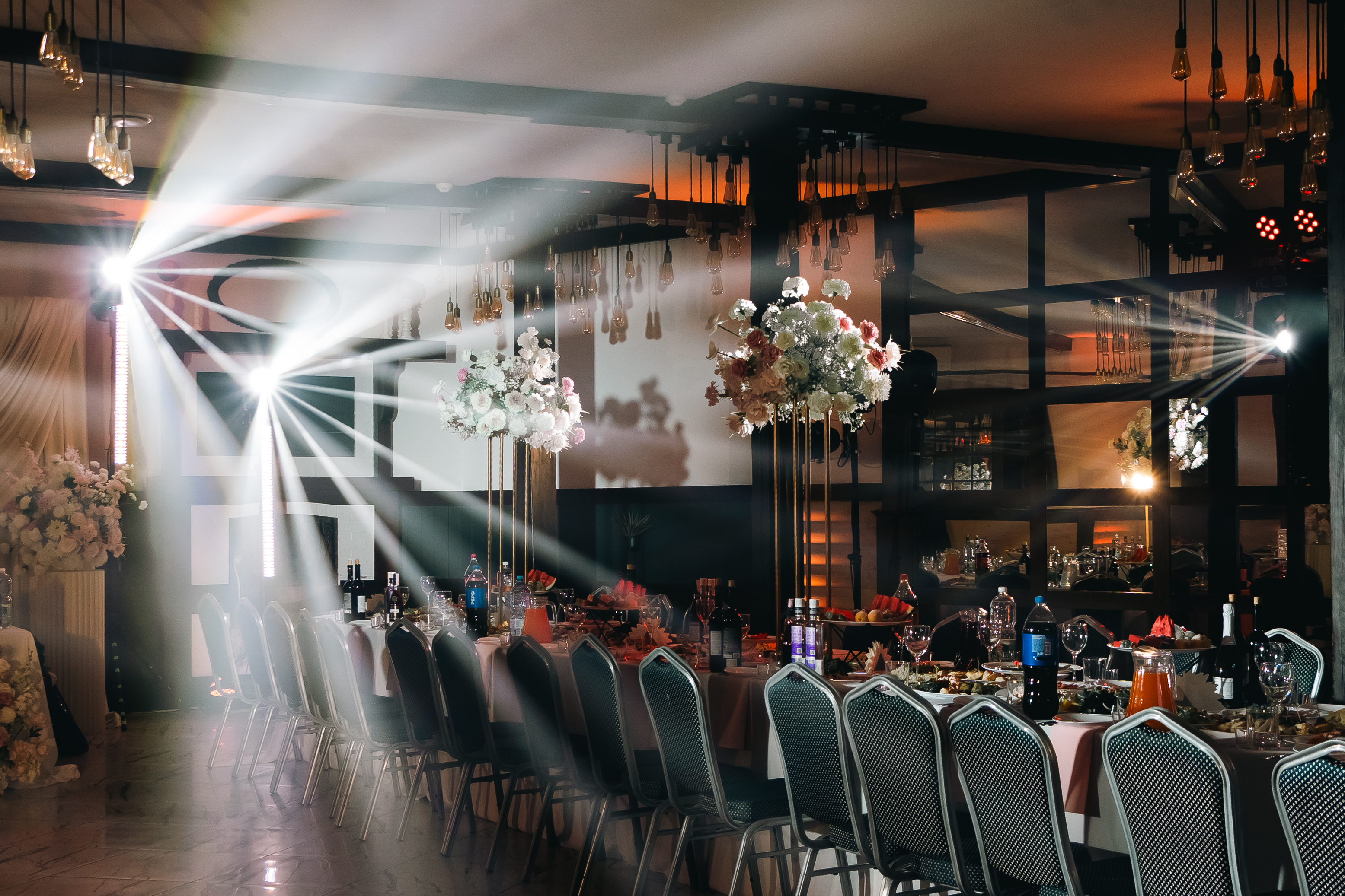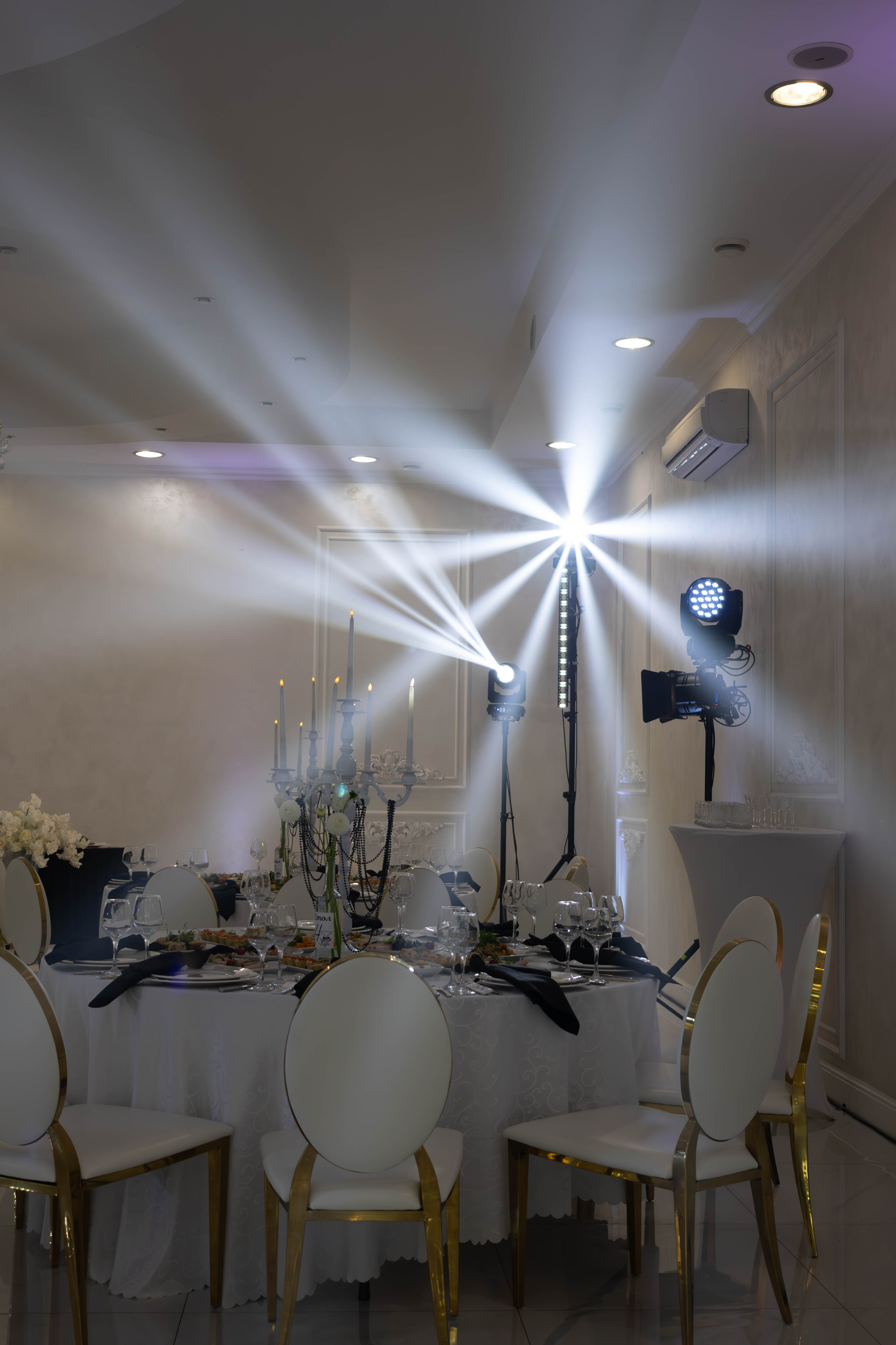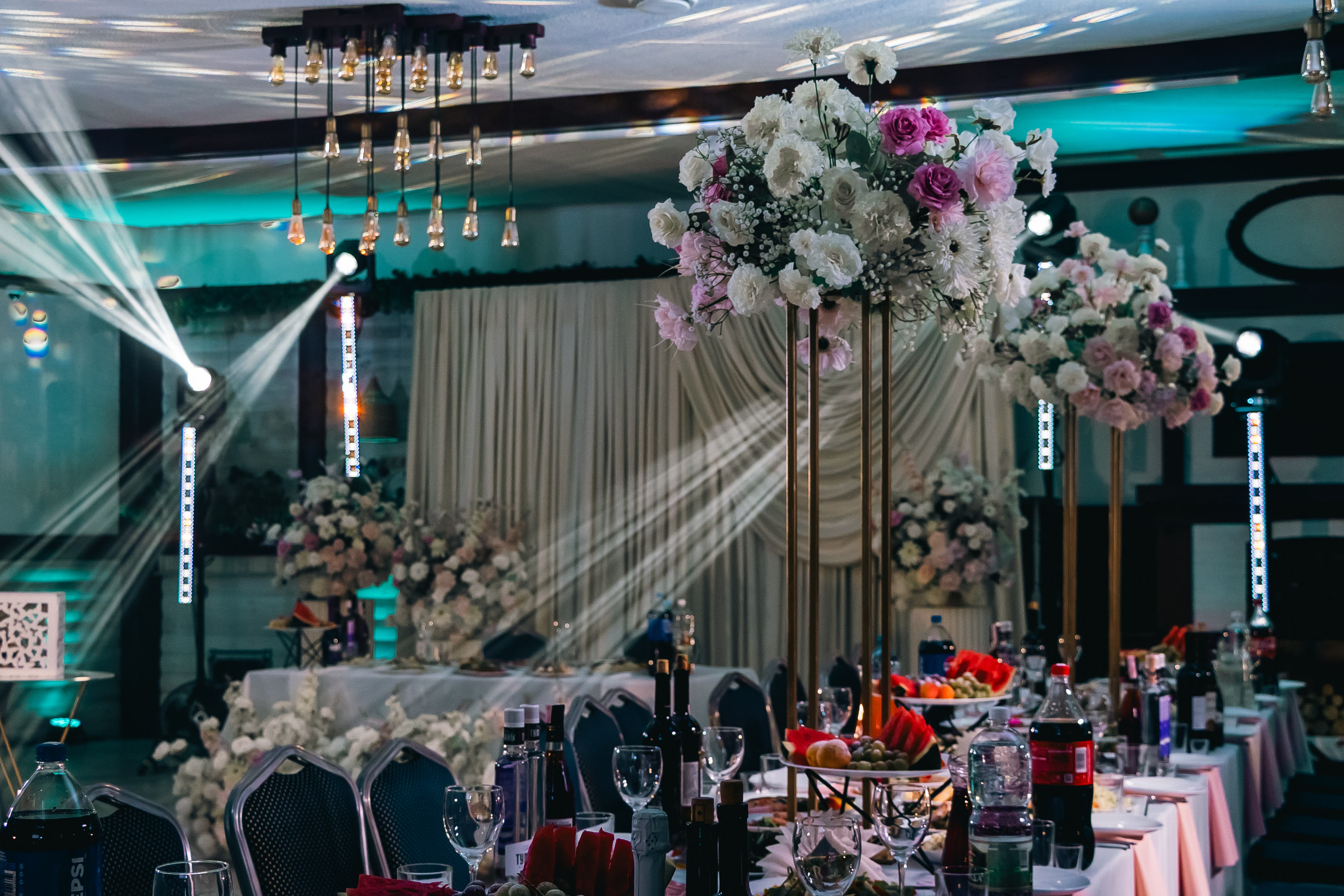 Для качественного оформления стандартного банкетного зала мы используем от 12 до 16 приборов, которые равномерно распределяются по периметру помещения.